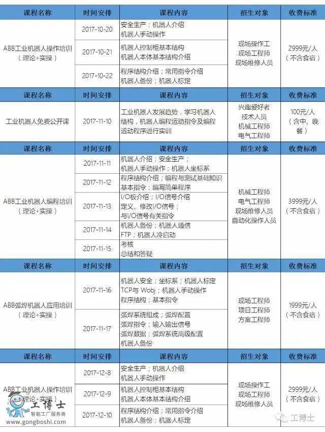 ![]() 2017年09月15日,工博士埃伏斯智能制造學院主辦的工業機器人公開課在科創基地正式開講。 本次有幸邀請ABB機器人中國培訓創始人李遠先生授課,在一天時間的公開課上,卻讓學員們觸碰到了講師在項目實踐與培訓當中積累的20年功底。深入淺出的授課方式,揭開了機器人的神秘面紗,讓機器人與我們更近、更熟悉。 課堂之后,學員們與講師相互探討,對機器人、對工廠自動化、對智能制造相互分享認識與見解,更加深切的感受到行業的變化、未來的發展趨勢和各自在時代中的責任,更堅定了自身的發展目標。 ![]() ![]() 本次機器人公開課提供一天的課時,主要面向的是智能制造工廠工程師及跨行業技術人員,希望能夠借此機會讓學員們更加清楚的了解機器人,理論知識結合機器人實體講解,更加深入地認識行業發展變化的大趨勢以及機器人各個應用的發展前景,緊隨時代發展步伐。 “并不是我們不行,而是時代在發生變化,必須提升技能適應社會變化”。 ![]() ![]() 從金秋九月開始,我們將在每月開設一天的機器人免費公開課,屆時歡迎大家的參加,讓我們近距離的了解工業機器人,為未來開啟一扇窗戶。 2017年ABB下季度課程時間安排 ![]() ![]() ![]() ![]() ![]() ![]() |