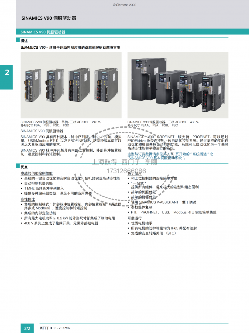 SINAMICS V90是一款針對基本的運動控制設計的伺服驅動器, 支持內部設定值位置控制、外部脈沖位置控制、速度控制和扭矩控制,整合了脈沖輸入、模擬量輸入/輸出、數字量輸入/輸出以及編碼器脈沖輸出接口。通過實時自動優化和自動諧振抑制功能,SINAMICS  V90***匹配SIMOTICS S-1FL6同步電機,可以自動優化為一個兼顧高動態性能和平滑運行的系統。